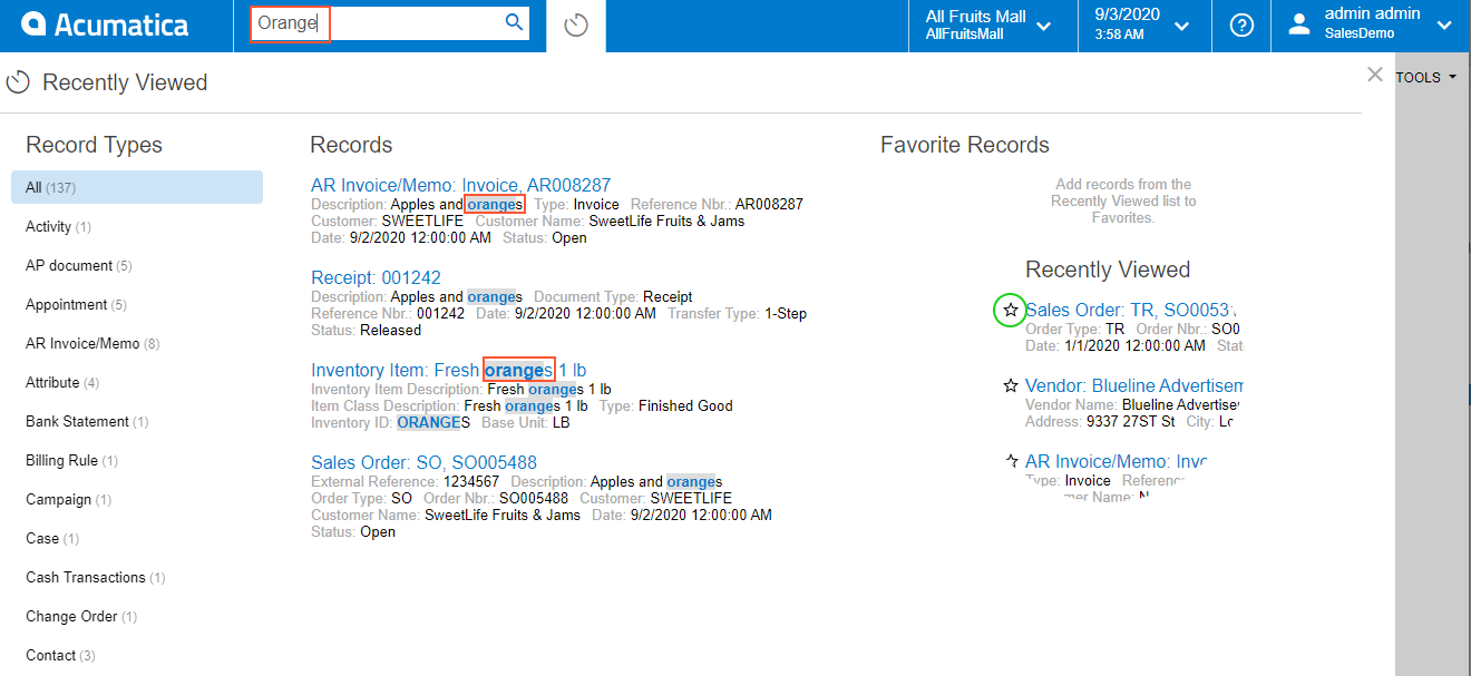 When you open the Recently Viewed workspace, you might see an enormous number of records, because the system keeps up to 500 of the most recently viewed records in the Recently Viewed workspace. If you know the key information about the record you are searching for—, like the name or the number of a record, or any information from the record description—you can search for this record by using the standard MYOB Acumatica search functionality. If you perform this search when the Recently Viewed workspace is open, the search is performed only among the records on this workspace. If this workspace is closed, then the system runs the system-wide search and displays all records that correspond to the user search request.