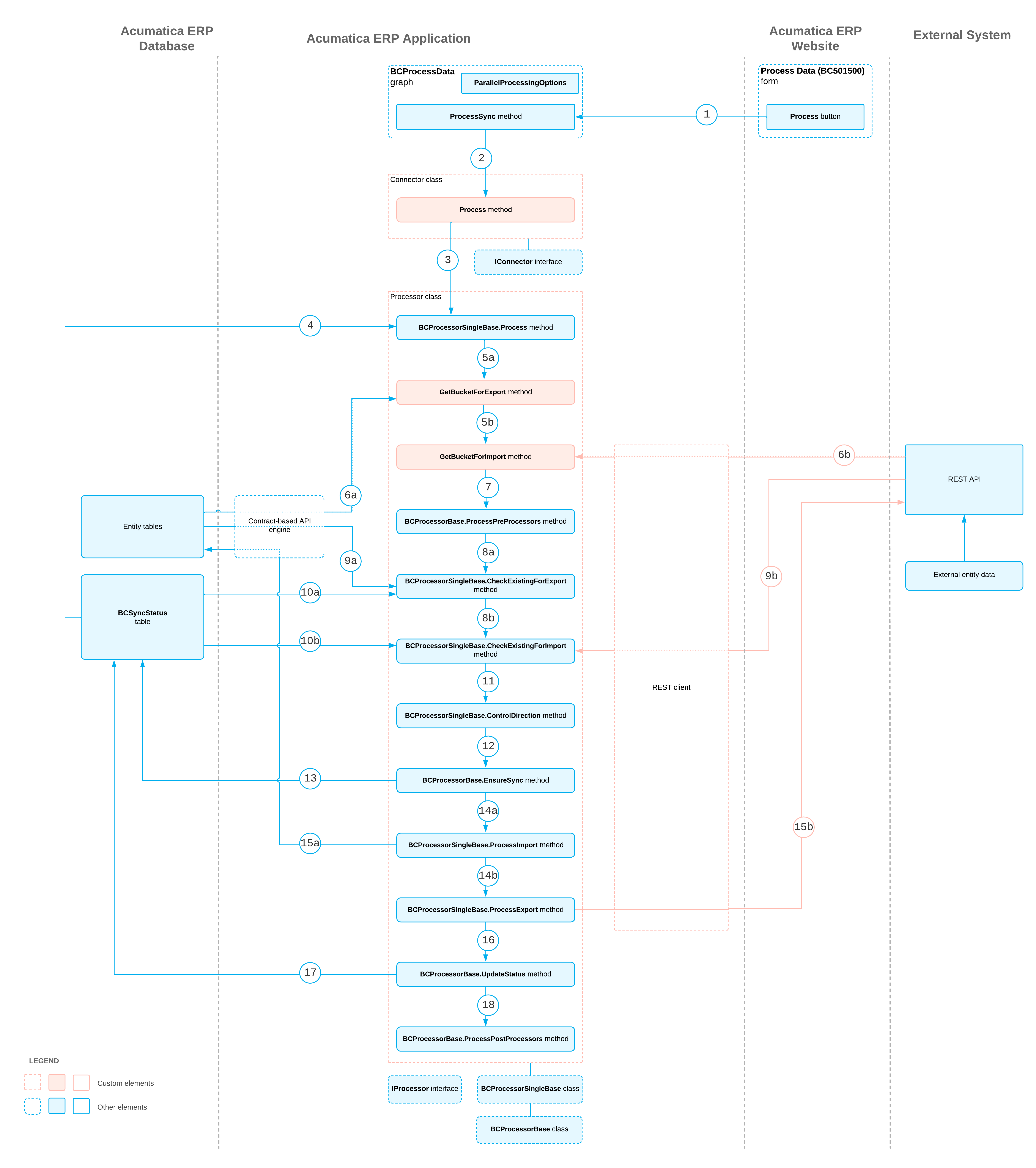 For each entity that should be synchronized, the implementation of the IConnector.Process() method creates an instance of the processor class, initializes it with the information about the current operation, and runs its IProcessor.Process() method (Item 3), whose default implementation is available in the BCProcessorSingleBase<> class.
