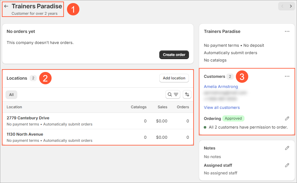 In Shopify, it is possible to sell goods and services to business customers and individual customers. A business customer is set up in the Shopify store as a company (see Item 1 in the screenshot below), whereas an individual customer is set up as a customer and can be associated with a company. A company may have multiple locations (Item 2), and multiple customers may be associated with the company (Item 3). Each customer that is associated with a company may be assigned a role in multiple company’s locations.