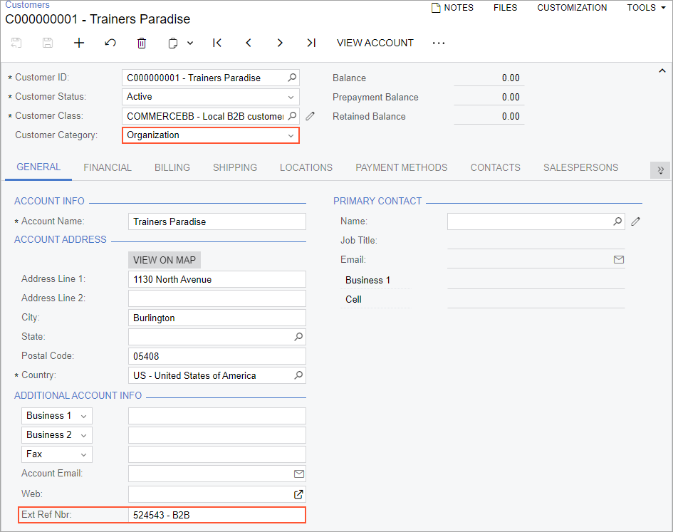 - The <Company Identifier> - <Store Name> reference to the customer of the Organization category in the Ext. Ref. Nbr. box on the General tab of the Customers (AR303000) form