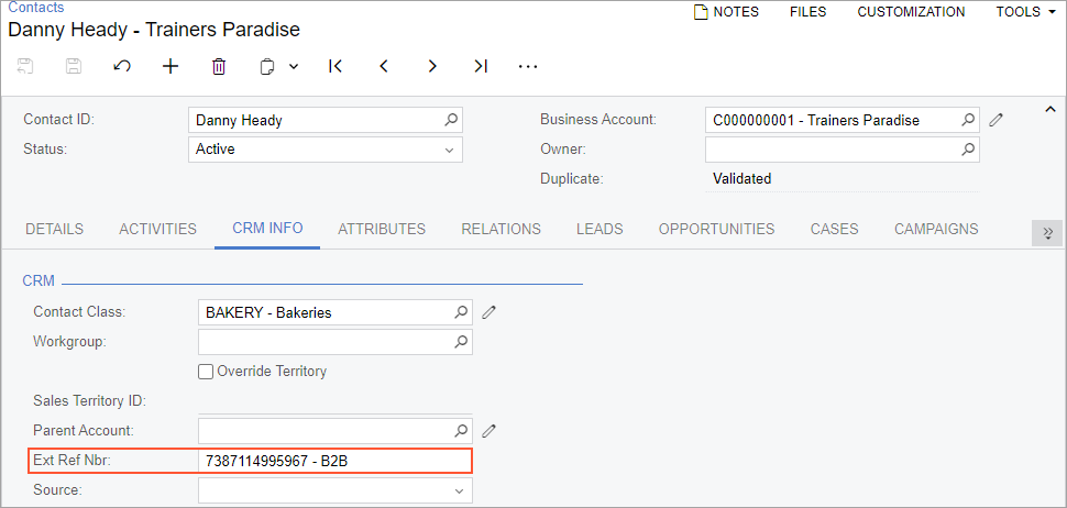 - The <Customer Identifier> - <Store Name> reference to the contact created for the customer associated with the company in the Ext. Ref. Nbr. box on the CRM Info tab of the Contacts (CR303000) form