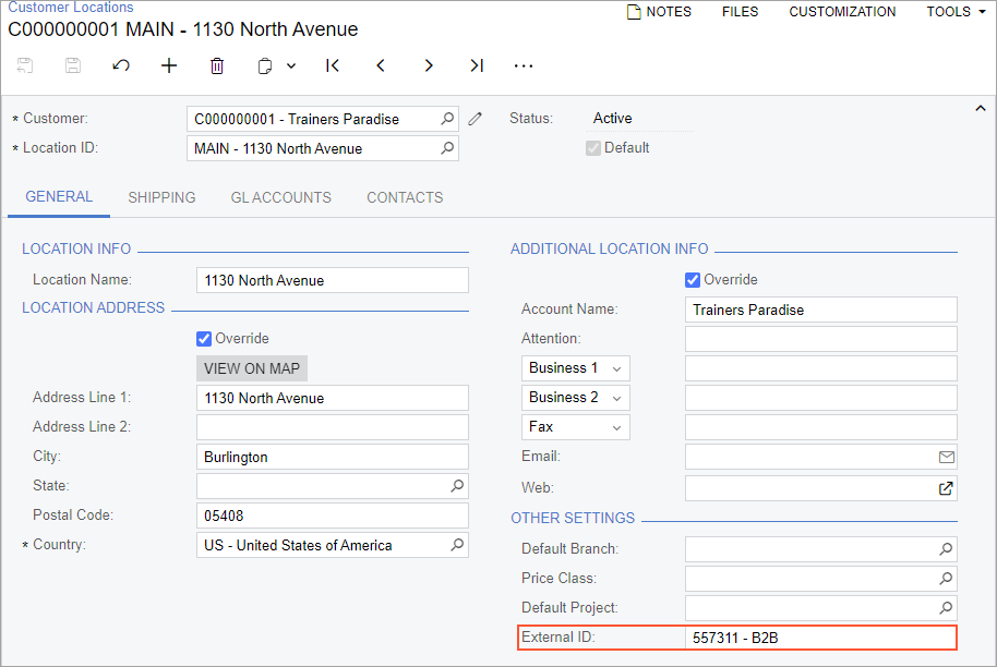 - The <Location Identifier> - <Store Name> reference to the company location associated with the company or to the customer location associated with the customer in the External ID box on the General tab of the Customer Locations (AR303020) form