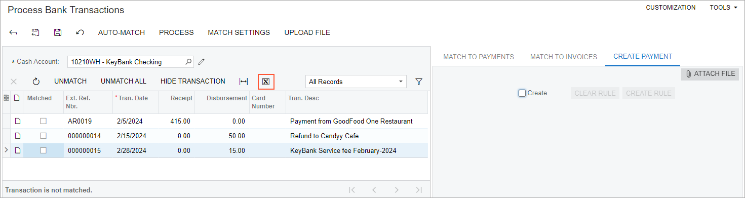 In MYOB Acumatica 2025.1, on the Process Bank Transactions (CA306000) form, the Export to Excel button has been added to the table toolbar in the left pane, as shown in the following screenshot.