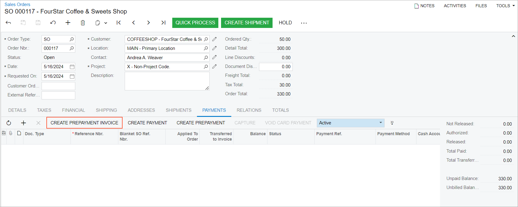 When a sales order has been created and saved on the Sales Orders (SO301000) form, a user can create a prepayment invoice to request a full or partial prepayment for the sales order. On the Payments tab of the form, the user clicks the Create Prepayment Invoice button (see the following screenshot).