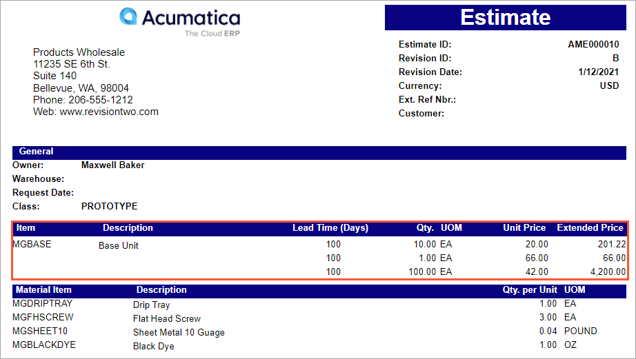 The Estimate Summary (AM641000) report has been enhanced to display the estimate price breaks that have the Print check box selected on the Price Breaks tab of the Estimate (AM303000) form. The following screenshot shows an example with the estimate's price breaks displayed.
