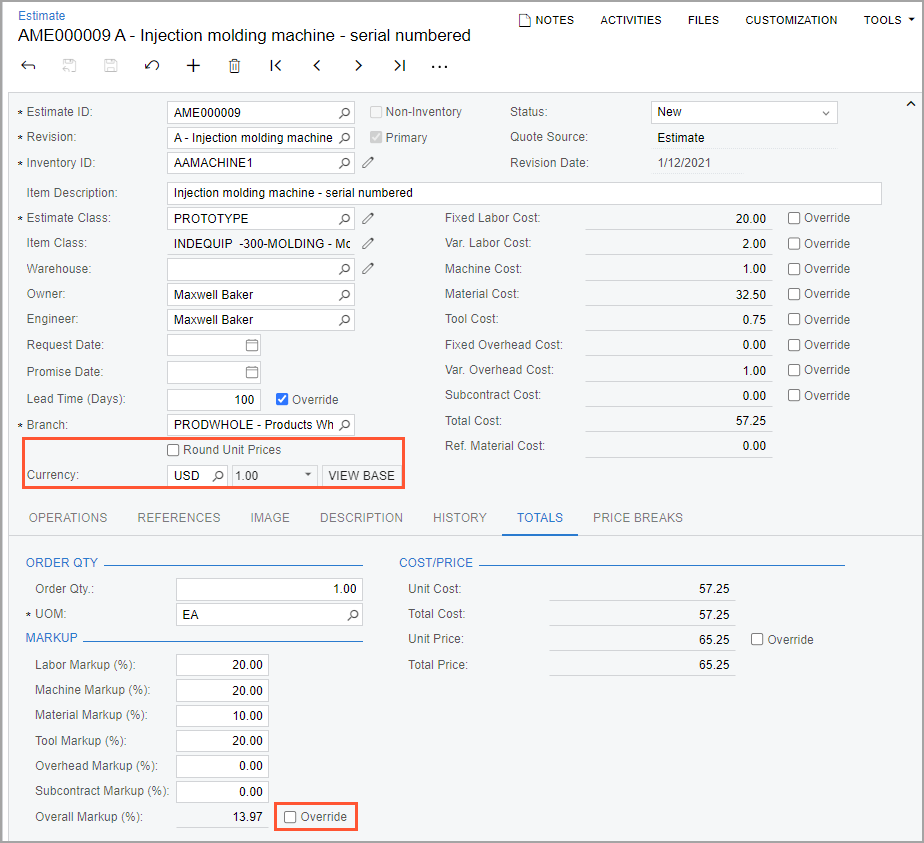 Also, the Round Unit Prices check box has been added to the Summary area of the Estimate form, as shown in the screenshot below. If the check box is selected, all unit prices specified on the Totals and Price Breaks tabs will be rounded to the nearest whole unit of the respective currency. For example, 10.49 USD will be rounded down to 10.00 USD, and 10.50 USD will be rounded up to 11.00 USD.