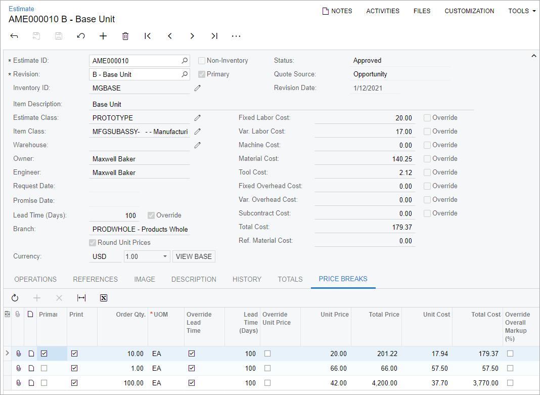 By specifying price breaks on estimates, users can accurately reflect cost variations based on order quantities and subcontracting costs, so that they can maintain margins and provide competitive pricing to customers. A sales engineer may find the new functionality beneficial in the following scenarios: