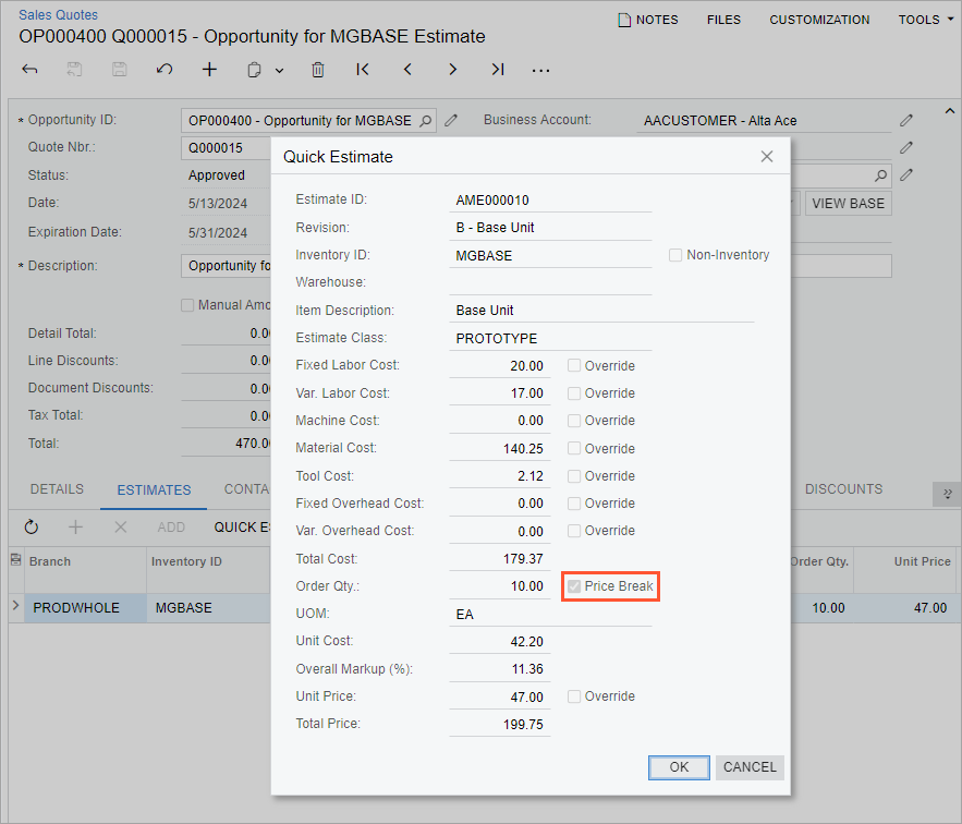 A new check box, Price Break, has been added to the Quick Estimate dialog box, which a user can open by clicking the Quick Estimate button on the Estimates tab of the Opportunities (CR304000), Sales Orders (SO301000), and Sales Quotes (CR304500) forms. This non-editable check box indicates whether the estimate record has price breaks. Also, if price breaks are available for the estimate record, the user can review the information displayed in the dialog box but cannot modify it to perform another quick estimate.