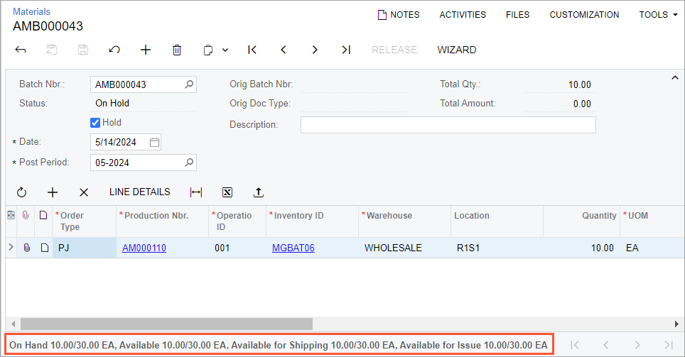 On the Labor (AM301000) and Move (AM302000) forms, the On Hand, Available, and Available for Shipping quantities (availability buckets) are now displayed in the table footer.