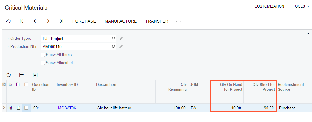 If the production order is integrated with a project, only material records with positive Qty Short for Project values are displayed on the Critical Materials form. If the production order is not integrated with a project, material records with positive Qty Short values are displayed on the form.