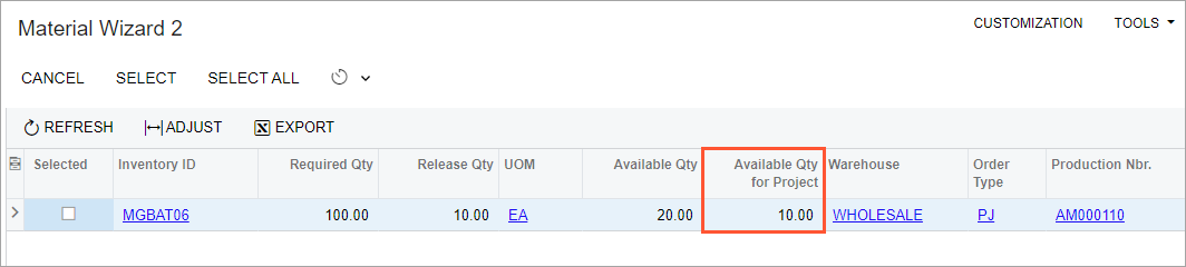 On the Material Wizard 2 form, a material line is displayed only if the production order is integrated with a project and the line's Available Qty for Project value is positive. The system will not display a material line if its Available Qty and Available Qty for Project values are 0 or negative or if the production order is integrated with a project and the line's Available Qty for Project value is 0 or negative.