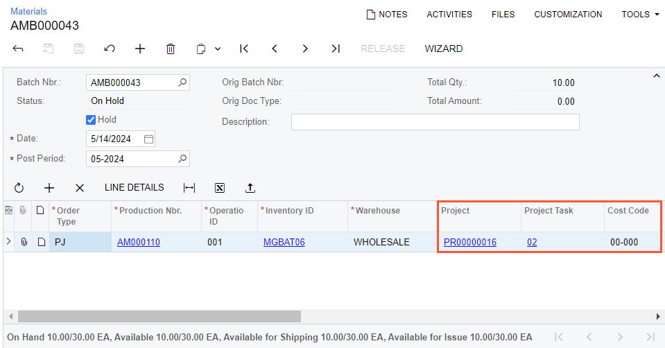 The Project, Project Task, and Cost Code columns have been added to the Labor, Move, Materials, Disassembly, Cost Transactions (AM309000), WIP Adjustment (AM308000), Material Wizard 2 (AM300020), and Vendor Shipments forms. If the associated production order is integrated with a project, the values specified in these columns will indicate how the resulting transactions will affect project costs.