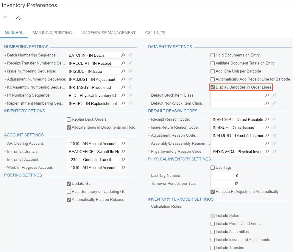 For some organizations, this behavior could be inconvenient because barcodes could be shared with customers or vendors, although they were used for internal purposes only. To address this issue, in MYOB Acumatica 2025.1, the new Display Barcodes in Order Lines check box has been added to the Inventory Preferences (IN101000) form, as shown in the following screenshot.