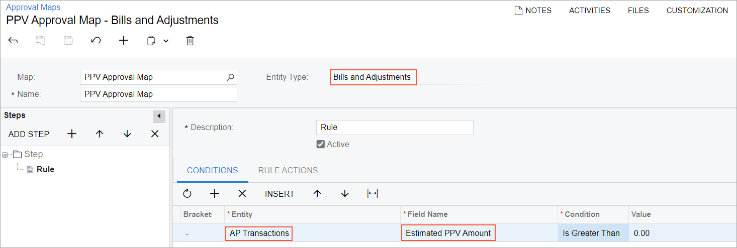 On the Approval Maps (EP205015) form, an administrator can now configure an approval map for the Bills and Adjustments entity type—that is, for AP bills and debit adjustments—based on the estimated PPV amount. In the approval map, the new Estimated PPV Amount option can be selected in the Field Name column on the Conditions tab for the AP Transactions entity, as shown in the following screenshot.
