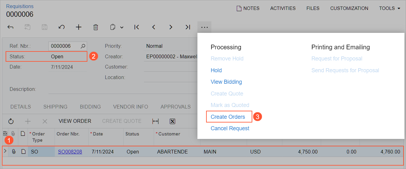 MYOB Acumatica 2025.1 introduces improved processing when a sales order or purchase order related to a requisition has been deleted and is no longer listed on the Sales Orders tab (see Item 1 in the following screenshot) or Purchase Orders tab of the Requisitions form. Now the system does the following: