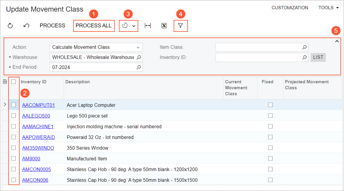 In MYOB Acumatica 2025.1, the Update Movement Class (IN506100) form has been redesigned to simplify and speed the processing and make the form consistent with other mass-processing forms (see the following screenshot).
