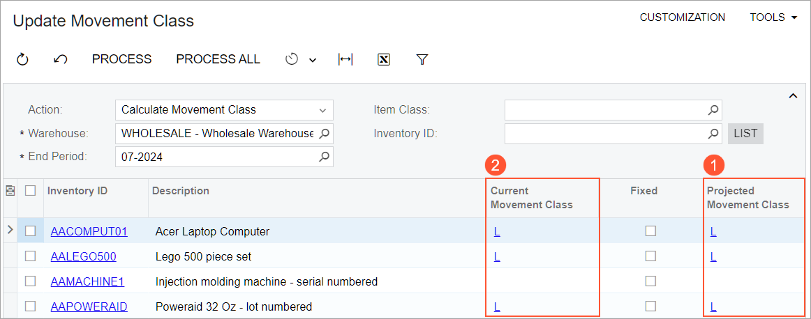 - Calculate Movement Class (default): The system calculates the movement classes to be assigned to the processed inventory items and displays them in the Projected Movement Class column (see Item 1 in the following screenshot).