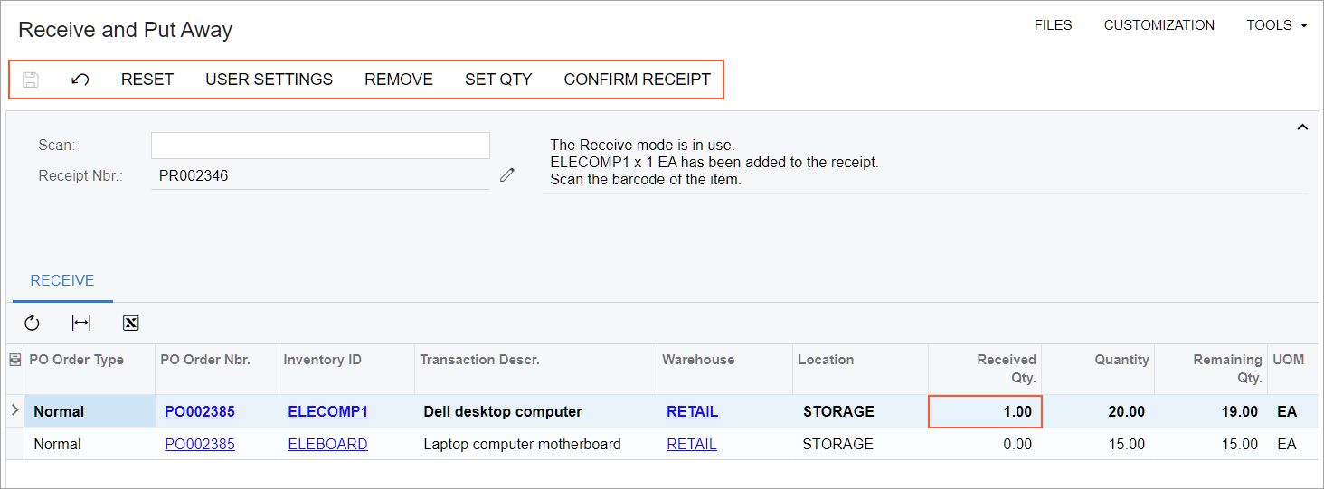 - The Confirm Receipt button is shown. The button becomes available when the Receipt Qty. in at least one line is greater than 0.