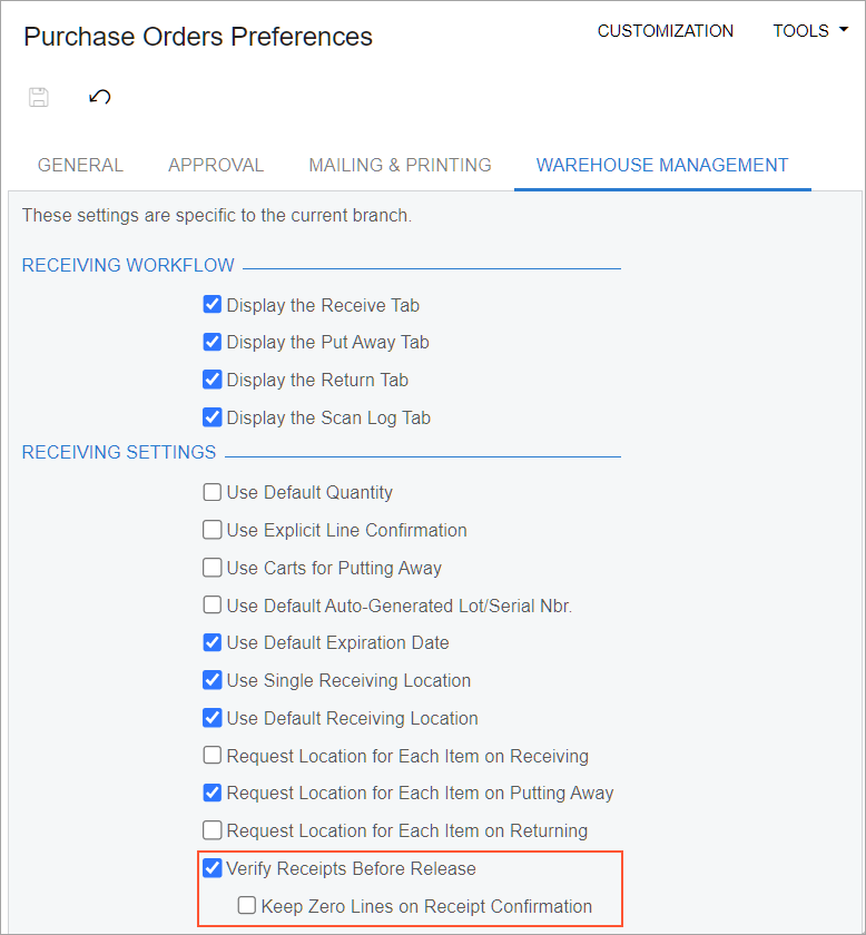 In MYOB Acumatica 2025.1, on the Purchase Orders Preferences (PO101000) form, the Verify Receipts Before Release check box has been added (see the following screenshot). When this check box is selected, a warehouse worker can no longer release a purchase receipt on the Receive and Put Away (PO302020) form. Instead, a warehouse manager (or another user responsible for this verification) verifies and releases purchase receipts on the Purchase Receipts (PO302000) form.
