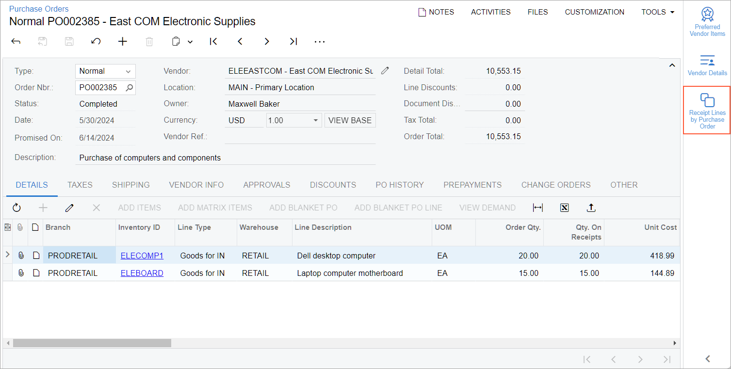 The Receipt Lines by Purchase Order tab has been added to the side panel of the Purchase Orders (PO301000) form (see the following screenshot).