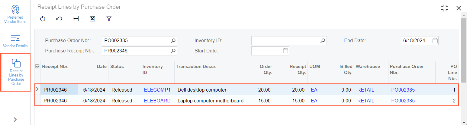 By opening and expanding the side panel, a warehouse manager can see the lines of purchase receipts related to the purchase order on the Receipt Lines by Purchase Order (PO3024BI) inquiry form (see the following screenshot).