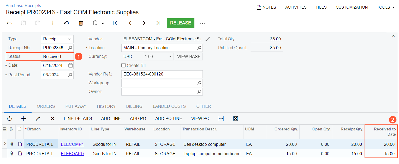 - A receipt is assigned the Received status (see Item 1 in the following screenshot) when a warehouse worker has confirmed the receipt of its items on the Receive and Put Away form.
