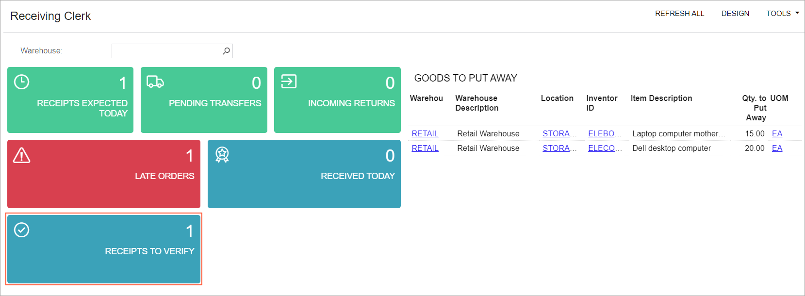 The Receipts to Verify widget has been added to the Receiving Clerk dashboard (see the following screenshot).