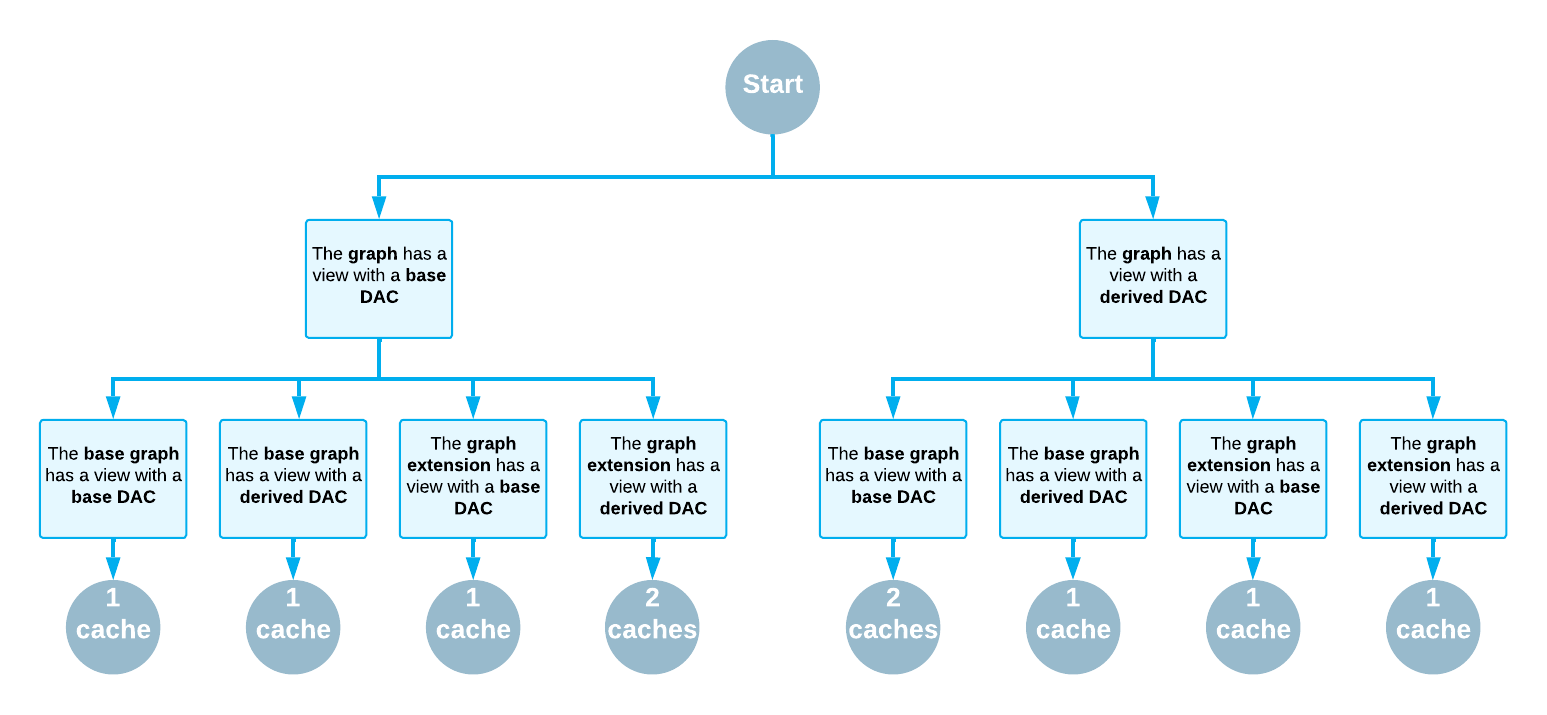 - If the view with the base DAC is declared first in the graph, the system creates two caches (one for the base DAC and one for the derived DAC). For each DAC, cache mapping points to its own cache with the same cache item type.