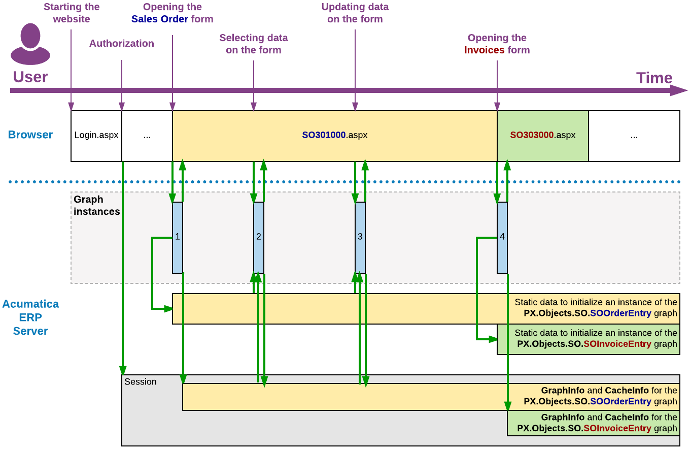 created to process a user request on the MYOB Acumatica server and destroyed once processing is completed.Figure 1. Processing of user requests In the diagram above, the blue rectangles labeled 1, 2, 3, and 4 indicate the lifetime