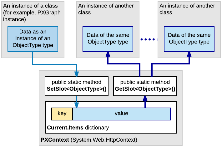 A slot provided by the PXContext class exists in the memory of the application server only during the current HTTP request. Therefore, you can use these slots for quick data exchange while the server processes a single request.