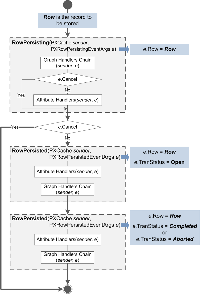 e.Canceldoes not equal true:RowPersistedis raised. The commit operation for the current data record (available throughe.Rowin the handler) is completed, but the transaction is still open:e.TranStatusequalsOpen.RowPersistedis raised one more time, either withe.TranStatusequal to Completed (if all changes have been saved successfully) or withe.TranStatusequal to Aborted if an error has occurred and all changes have been canceled.
