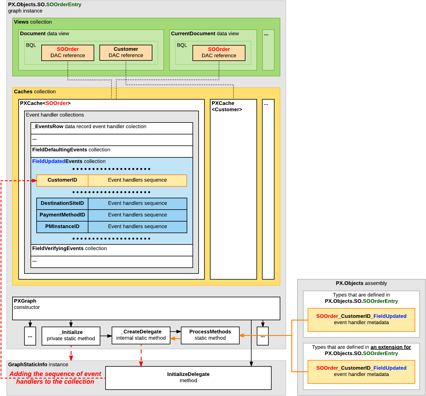 The following diagram shows how an instance of the PX.Objects.SO.SOOrderEntry graph uses the PX.Objects assembly metadata to add the SOOrder_CustomerID_FieldUpdated()