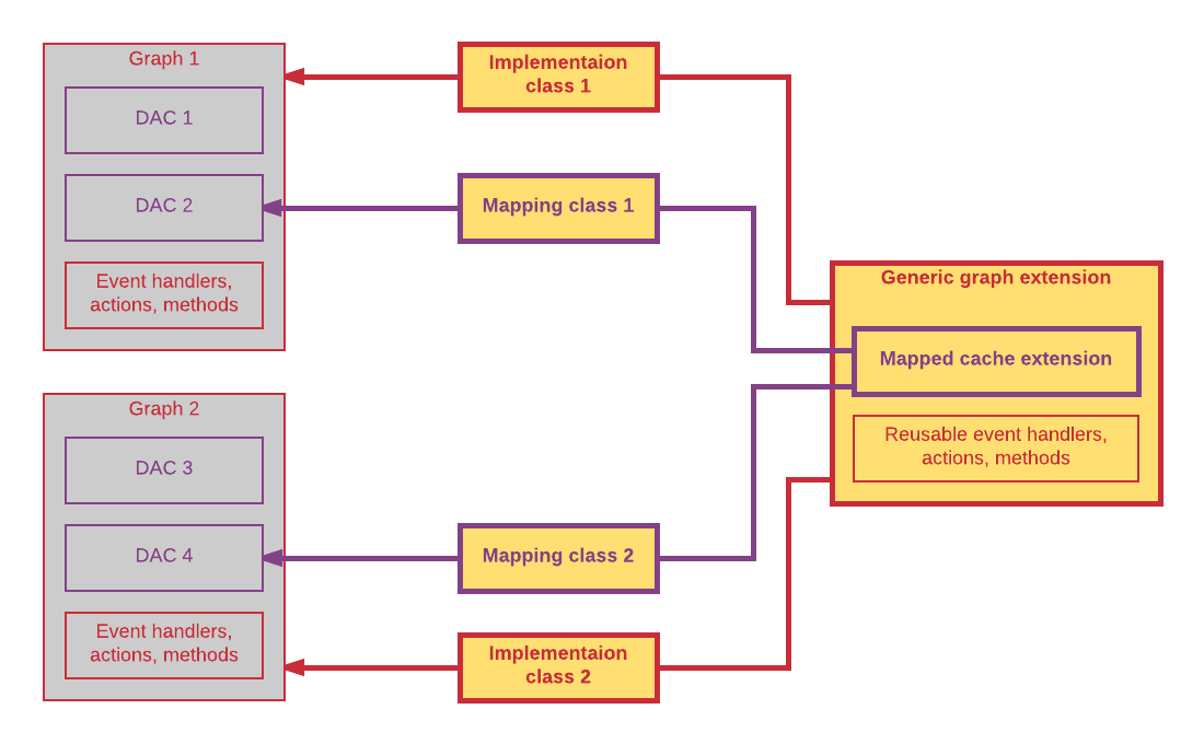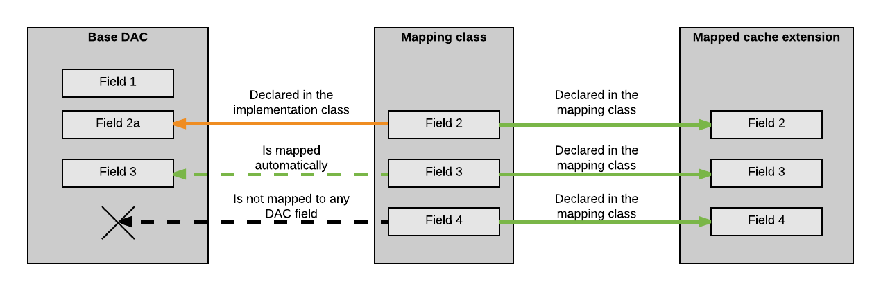 A mapped cache extension is an analog of a data access class (DAC) for a generic graph extension. In the mapped cache extension, you include the main fields that are used in the reusable business logic implementation. You map the fields of a mapped cache extension to the fields of a base DAC by using the mapping class, which is described in the following section. The mapped cache extension can also include the fields that are not mapped to any base DAC fields. (For details, see Mapped Cache Extensions and the Application Database.)