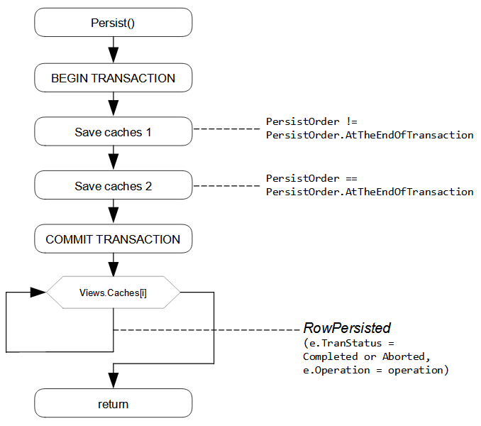 In the Persist() method, the system starts the database transaction (see the diagrams below). Within the transaction, the collection of cache objects is divided into two groups: