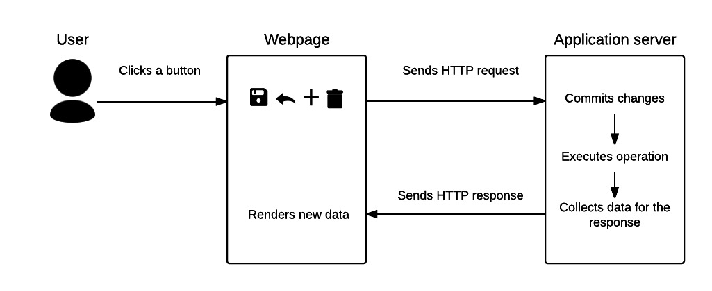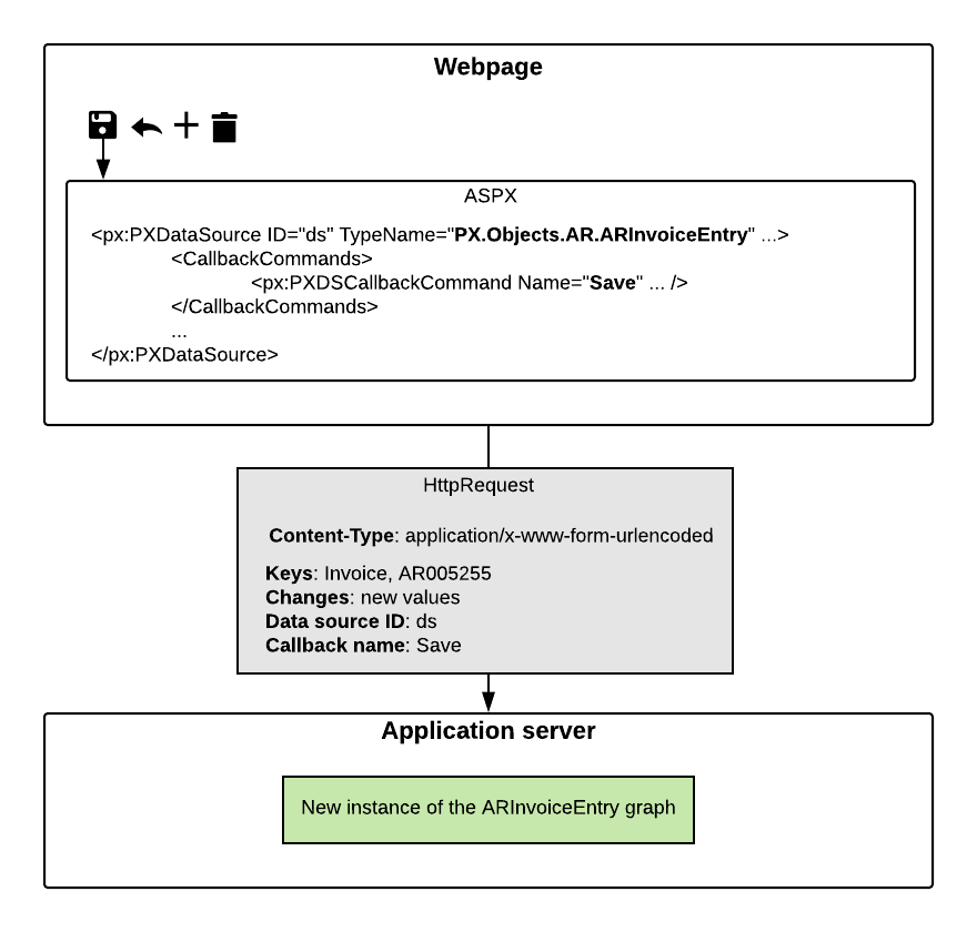 When a user clicks a button on an ASPX page, such as the Save button on the toolbar of a form, the webpage creates a postback HTTP request to the server. When processing the request, the application server does the following: commits changes (if required by the operation initiated by the user), executes the operation, and collects data for the response. Then the application server sends the response to the webpage, which renders the new data.
