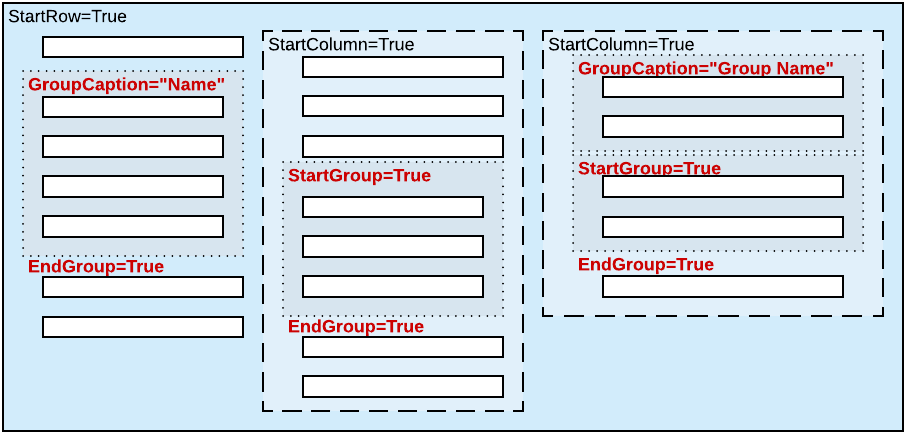 You end a group by using a PXLayoutRule component with a GroupCaption, StartGroup, or EndGroup property specified. Therefore, if there is another group that starts immediately below a group, you can omit the layout rule that ends the upper group, as shown in the third column of the row displayed in the example in following diagram.