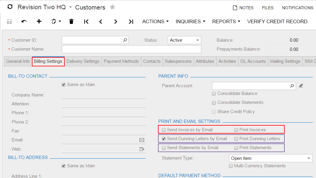 Settings tab item on the Customers (AR303000) form has three pairs of merged check boxes in the