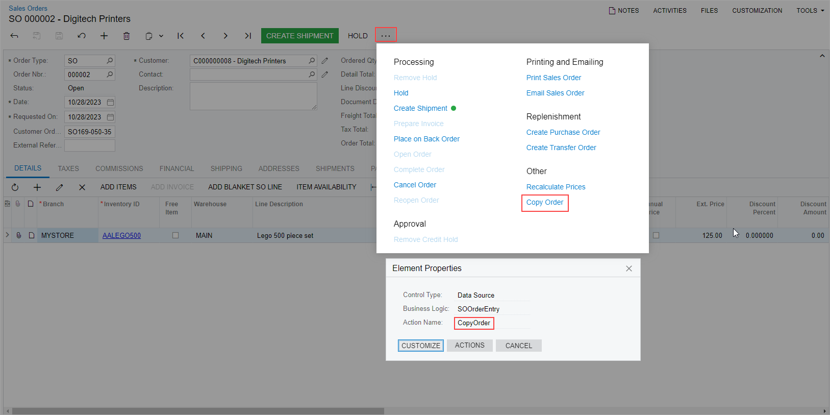 modify to open the Element Properties Dialog Box.Note: If the action is only represented by a command on the More menu, open the More menu to display the command and use the keyboard shortcut Ctrl+Alt+Click to inspect the command in the More menu, as shown in the following screenshot.
