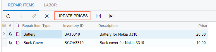 - On the Repair Items tab, in the row with the BAT3310 inventory ID, enter 25 in the Price column.
