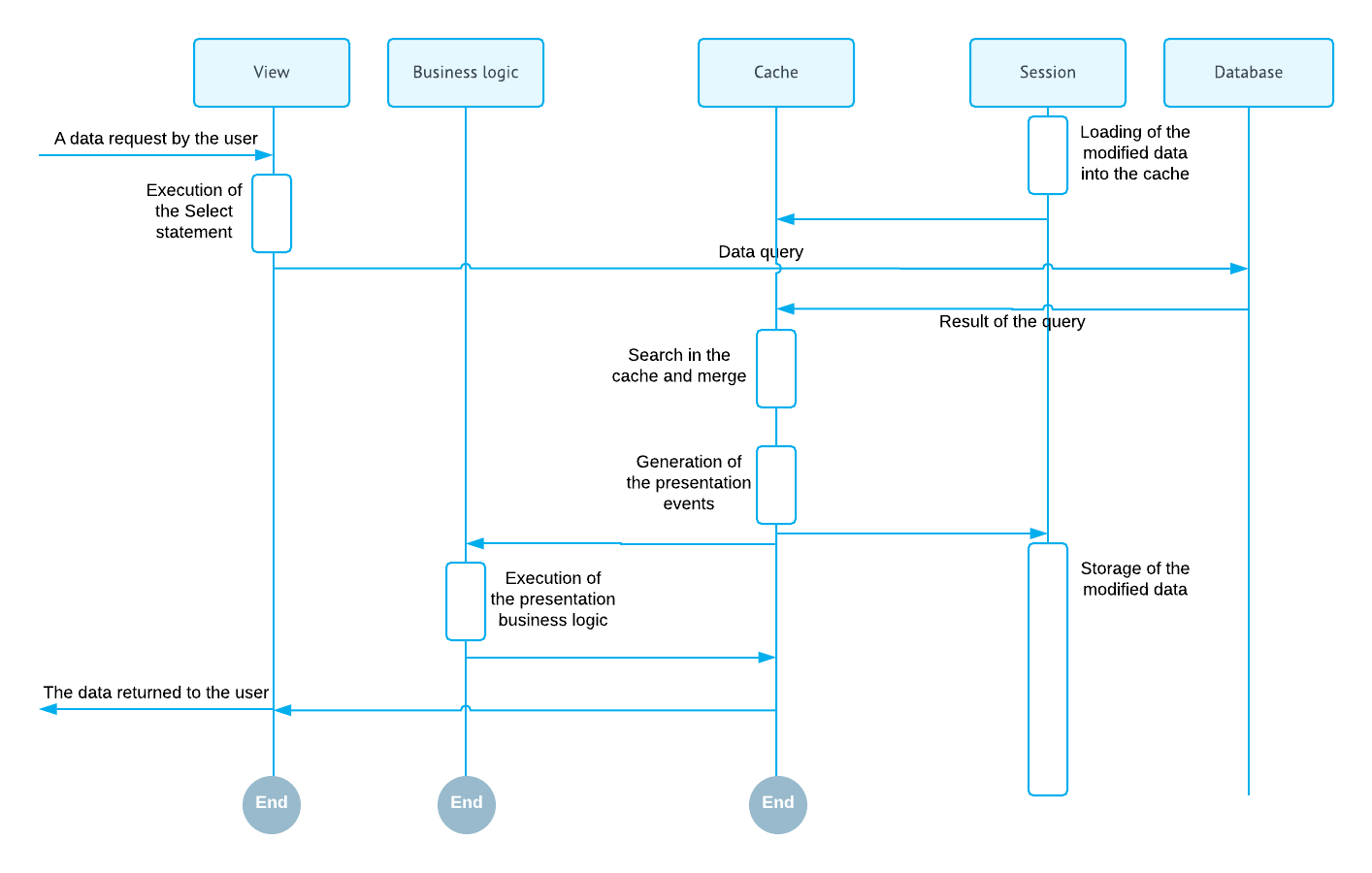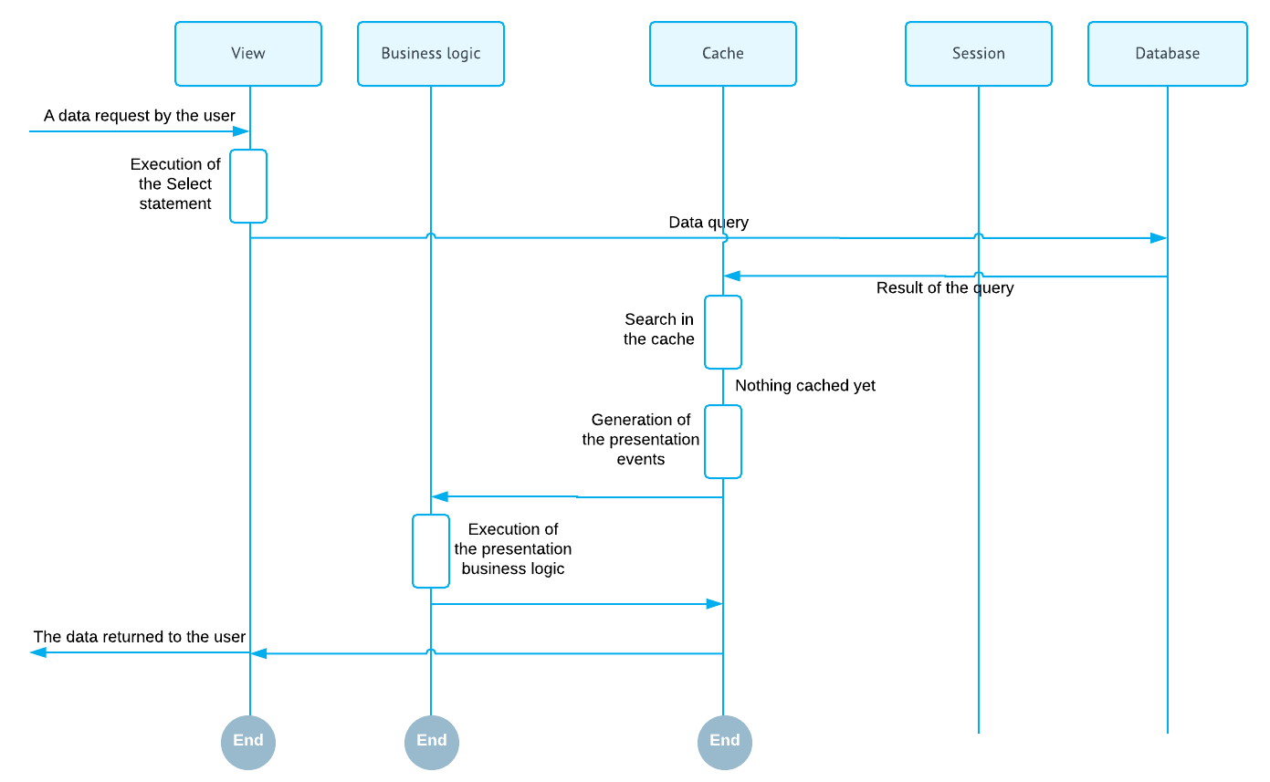 The data can be requested through the Select method of the data view. During this operation, the systems executes BQL command from the data view declaration. The data returned by the BQL command is passed to the requester. The following diagram illustrates this process.