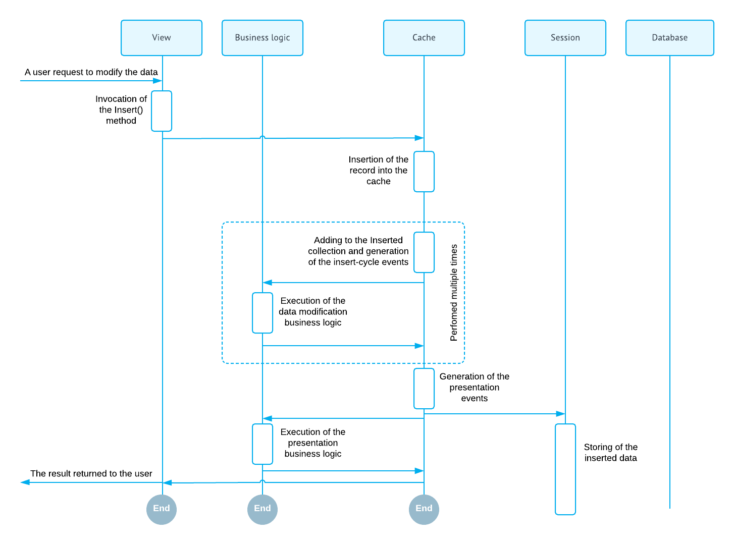 A new record can be inserted into the cache through the Insert(record) method of the data view. The new inserted record is added to the Cached collection and marked as inserted. The diagram below illustrates this scenario.