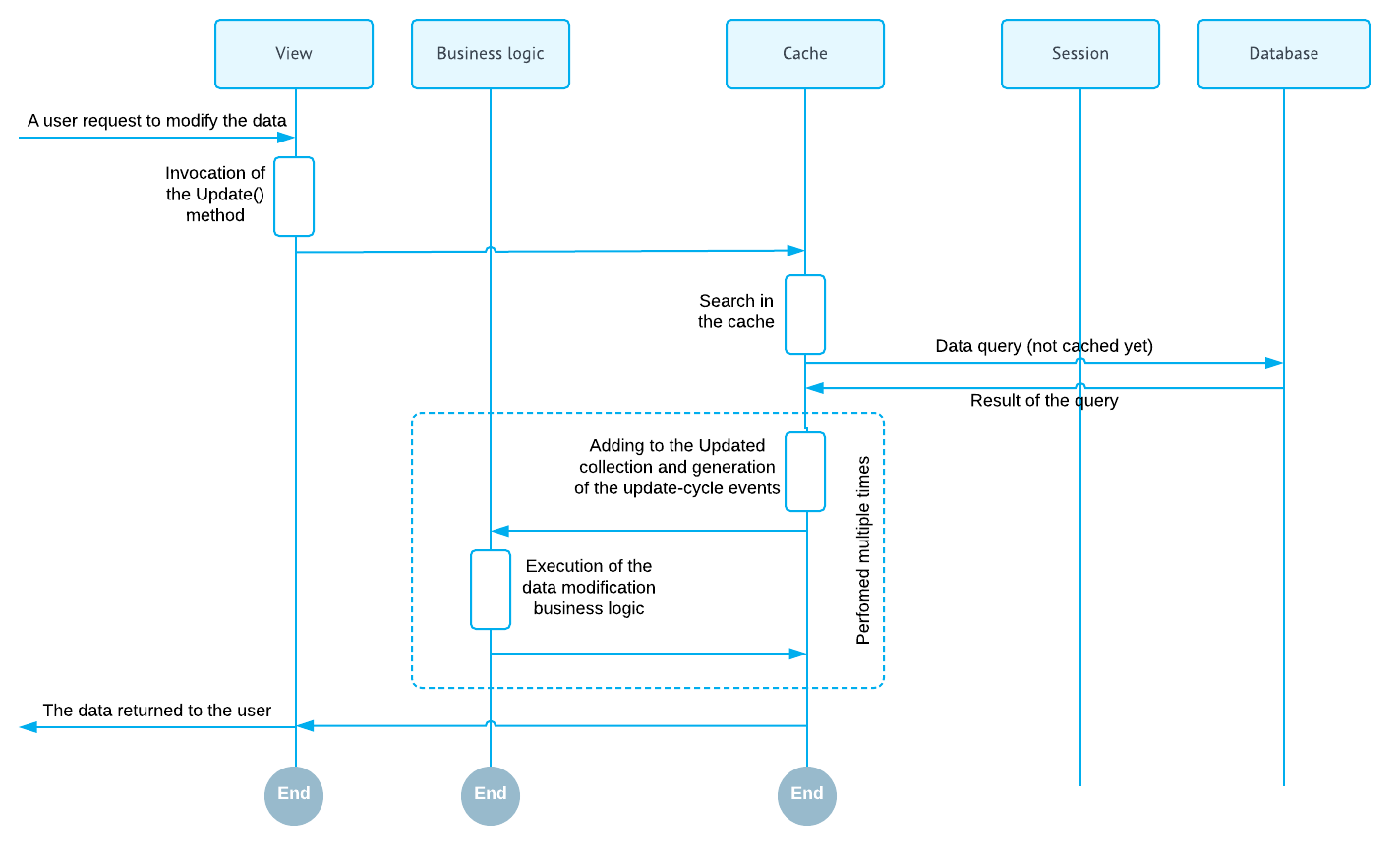 It is important to understand that a graph is a stateless object. It is discarded after each data request. In order to preserve the modified data version between the requests, the cache controller serializes the Cached collection into the session state and restores it later when the graph is instantiated on the subsequent request. In this scenario, it is very important that the cache contains only the modified entity records, not the complete entity record set.