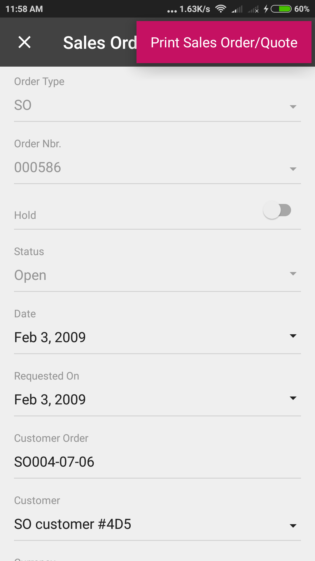 Figure 2. Viewing the report action button on the Sales Orders screen