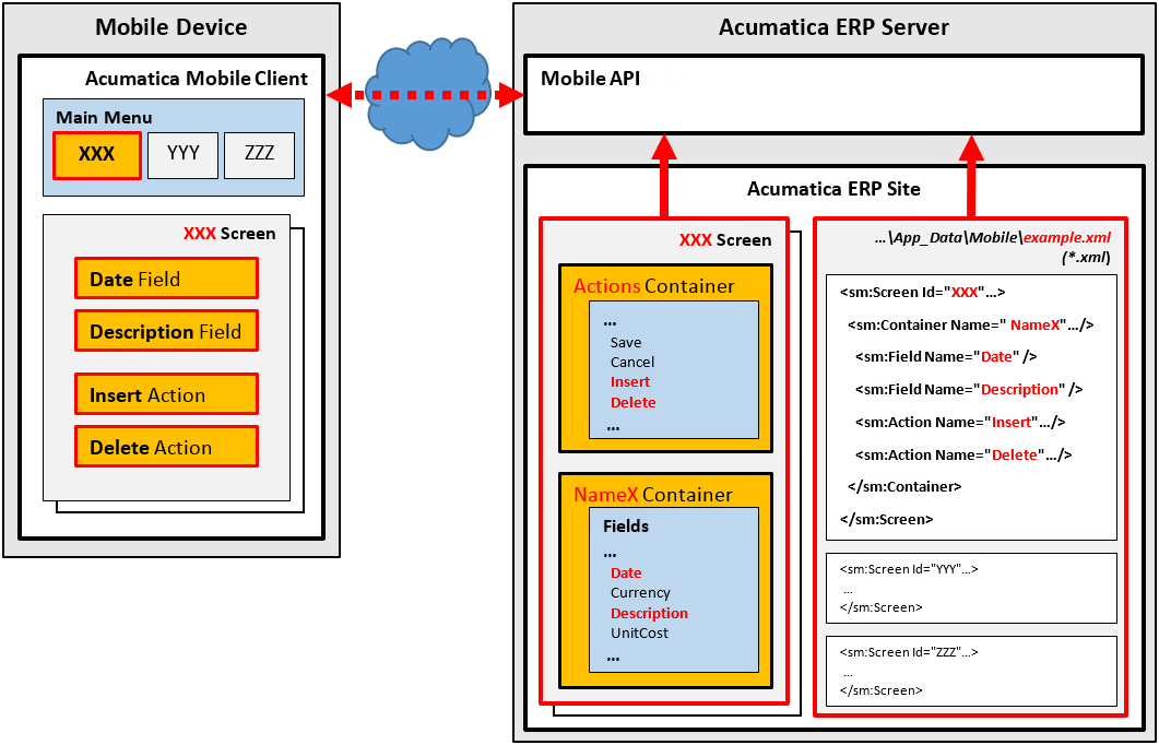 screen of MYOB Acumatica to the screen on the mobile device, as the following diagram shows.Figure 1. Use of an XML file to configure a screen in the mobile app