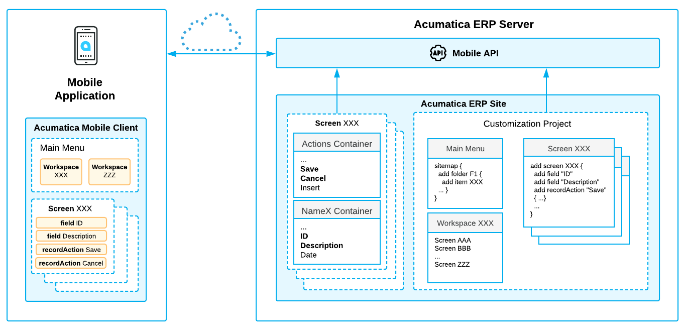 The diagram above shows how the MYOB Acumatica Mobile Framework uses the MSDL code to configure the XXX screen in the mobile app. (See Configuring the Mobile Site Map for details.) You declare the desired screen, workspace, containers, fields, actions, and other objects by using Mobile Site Map Definition Language (MSDL) in the Customization Project Editor. The objects you want to be displayed on the mobile app screen must be present on the original MYOB Acumatica form (see Getting the WSDL Schema).