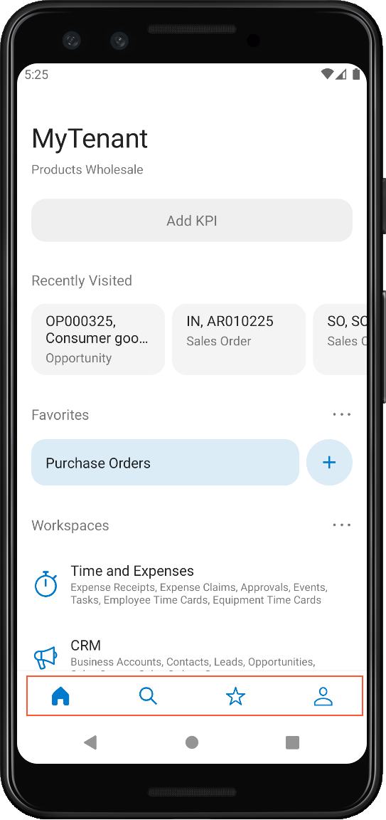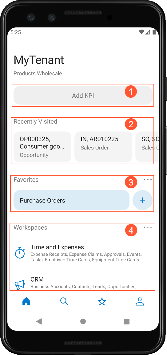 The following screenshot shows the Home screen of the mobile app. The menu contains a placeholder for adding KPI widgets (see Item 1 in the screenshot), the list of recently visited screens and records (Item 2), the list of screens and records marked as favorites (Item 3), and the tiles with the workspaces (Item 4).