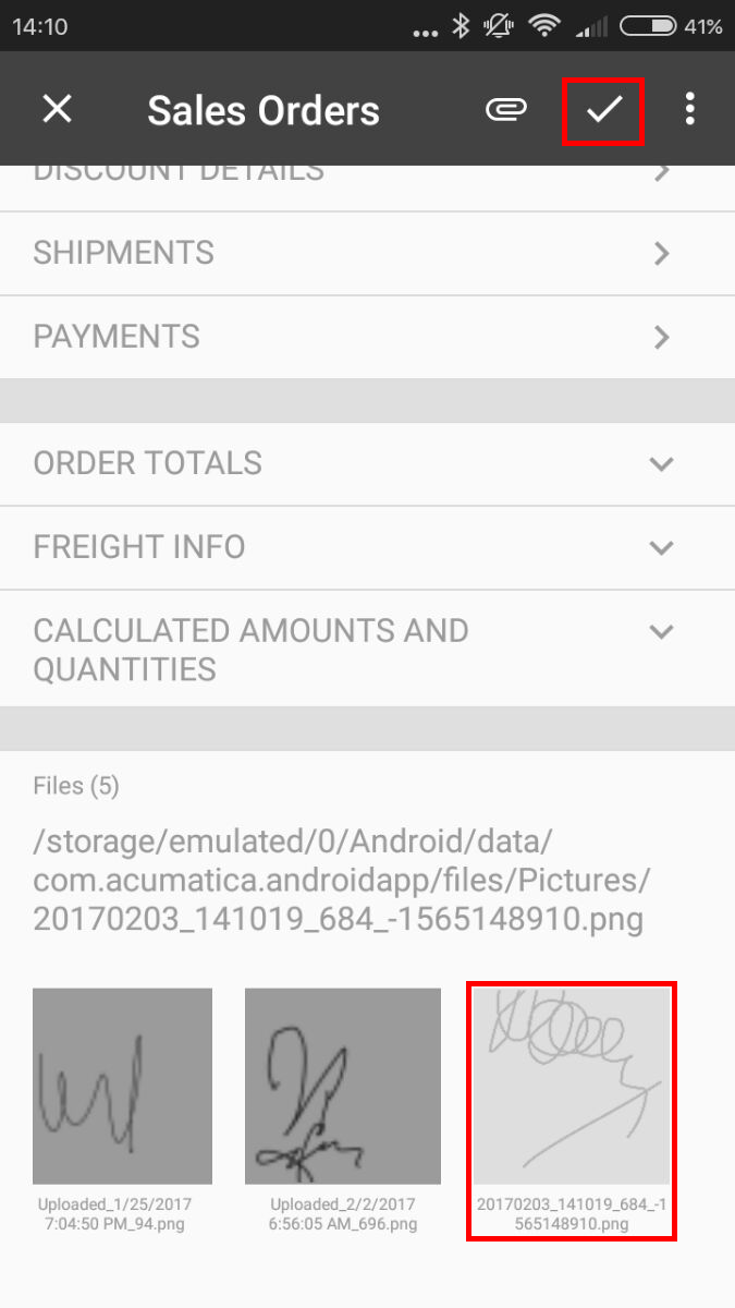 signature file in the database, the user should click the Save button.Figure 3. Viewing the signature added to the screen of the mobile app After the user clicks Save on the screen toolbar, the mobile app sends the signature file