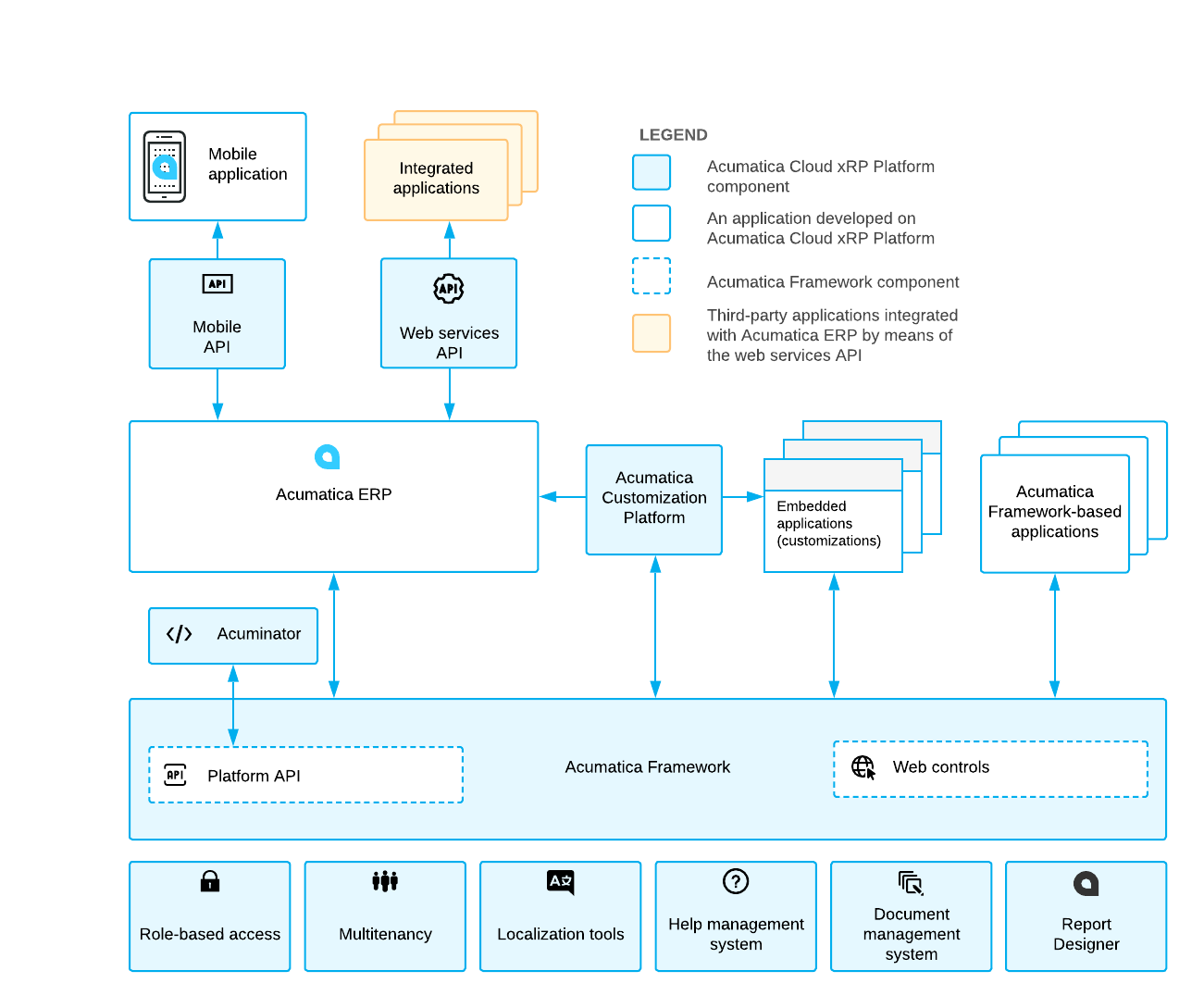 MYOB Acumatica Framework provides the platform API and web controls for the development of the UI and business logic of an ERP application. The platform API is used for the development of MYOB Acumatica and any embedded applications (that is, customizations of MYOB Acumatica). MYOB Acumatica Framework can also be used to develop an ERP application from scratch.