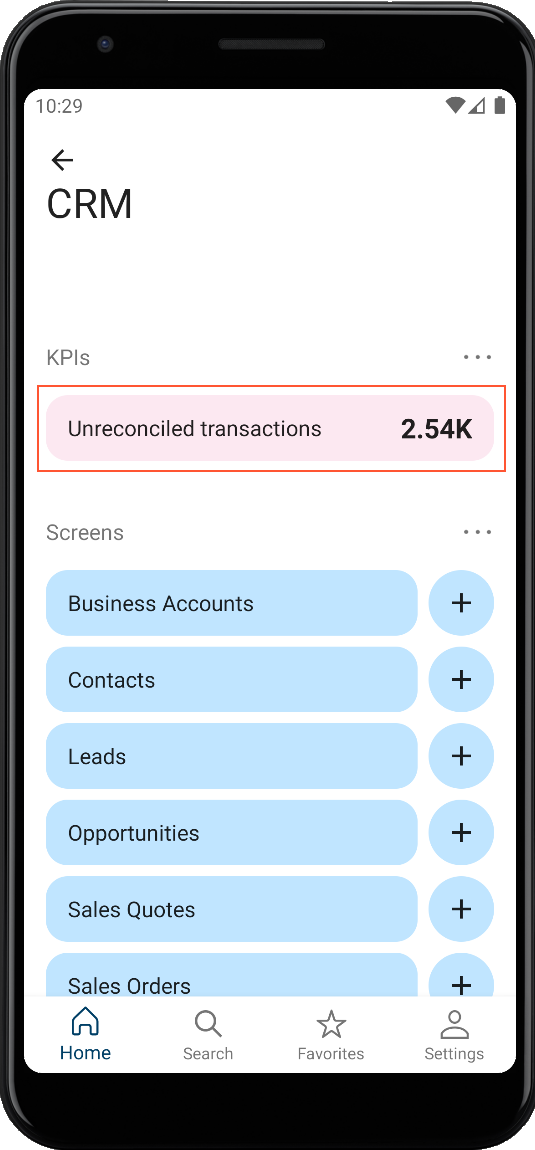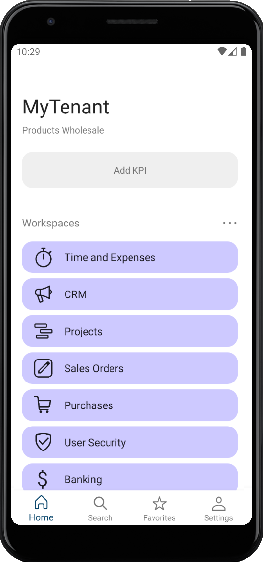 The main menu of the MYOB Acumatica mobile app consists of workspaces, a placeholder for adding KPI widgets, the list of recently visited screens and records, the list of screens and records marked as favorites, and the bottom menu with the Home, Search, Favorites, and Settings buttons. A user can go to any of these parts of the mobile app by tapping the needed part of the screen[2]? The main menu provides access to workspaces in the mobile site map, and the workspaces are used to organize the screens.2022/02/0415:00:27+03:00.