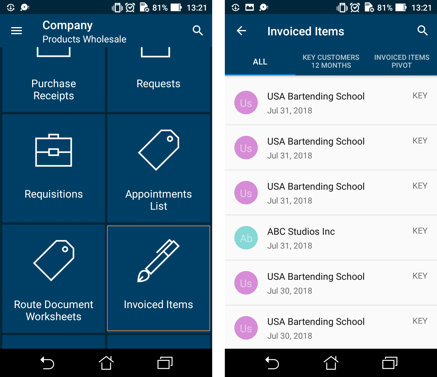 add screen GI000008 { add container "Result" { add field "AccountName" add field "CustomerClassID" add field "InvoiceDate" } } - Update the main menu of the mobile app with the following code. For details, see
